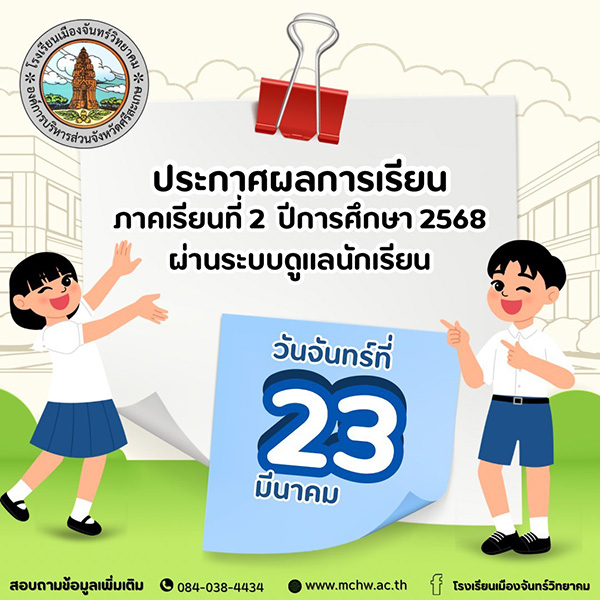 โรงเรียนเมืองจันทร์วิทยาคม ได้รับการประเมินคุณภาพภายนอกจาก สมศ. สำนักงานรับรองมาตรฐานและประเมินคุณภาพการศึกษา (องค์การมหาชน) รอบที่ ๕ ระดับการศึกษาขั้นพื้นฐาน (พ.ศ.๒๕๖๗-๒๕๗๑) ณ หอประชุมจันทร์กระจ่าง โรงเรียนเมืองจันทร์วิทยาคม